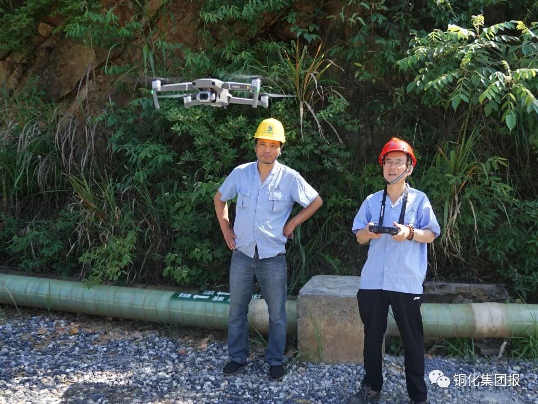524日,新橋礦業(yè)公司露采工區(qū)環(huán)保員羅健(左)和無人機操作員王夫谷來到該公司四房排土場,首次利用無人機從空中拍攝該區(qū)域環(huán)境整治情況?!√丶s記者 肖邦魁