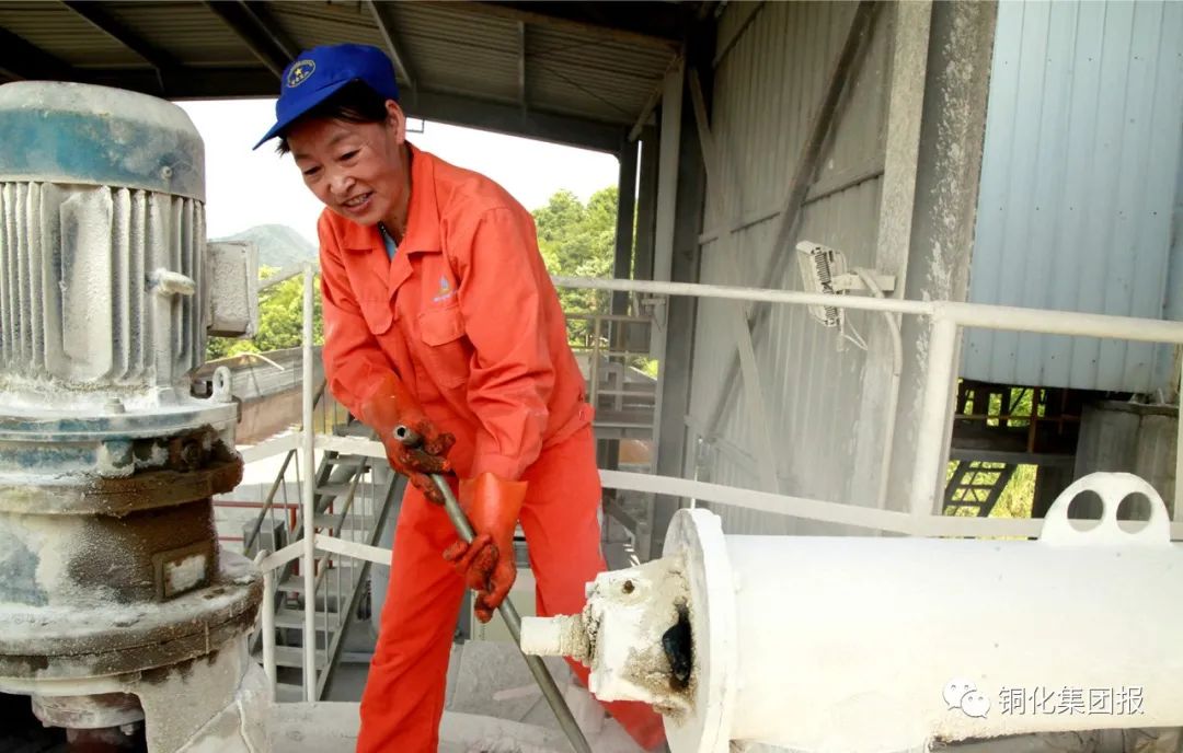 圖③:在選礦廠磨浮車間,選礦女工正在用pH試紙測(cè)試礦漿酸堿值。