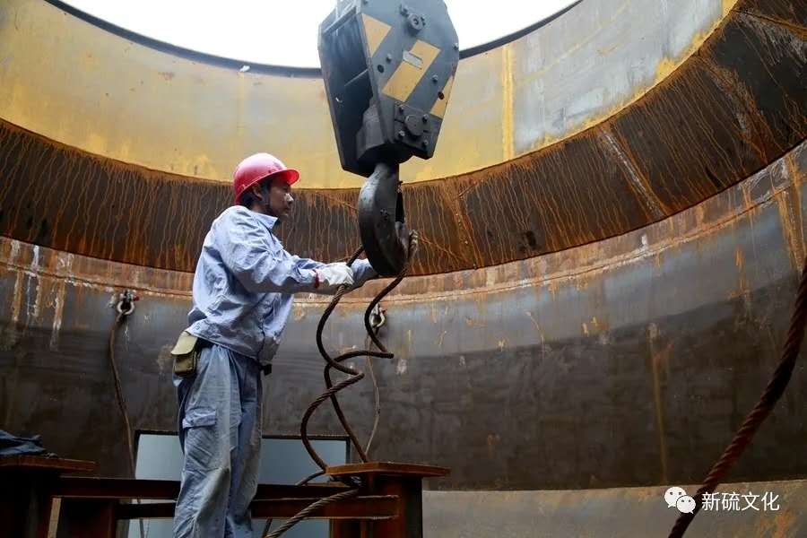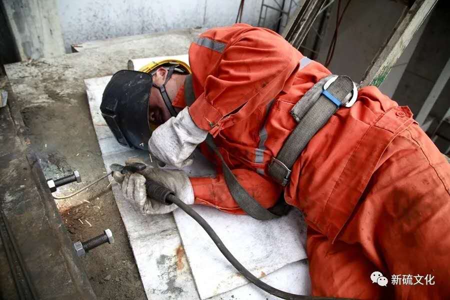 地面上大吊車、大貨車,選礦廠相關(guān)負(fù)責(zé)人、技術(shù)人員、安全員等忙著起吊龐然大物時,“焊高組”在底座上也一刻沒閑著,拖運(yùn)電焊設(shè)備、準(zhǔn)備焊接材料、在底座上鋪水泥保持平面,各個槽體支腳找平衡......由于底座緊挨著磨浮車間,空氣不流通,加上天氣悶熱難擋,武裝整齊的好“焊”們一會就汗?jié)窳斯ぷ鞣?,汗珠順著安全帽壓著的發(fā)根往下滾。